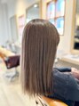 ベージュベースに青よりのバイオレットをいれて夏でも暑苦しくない赤みのあるカラーに仕上げましたスタイルは肩に当たるくらいの長さで自然に外にはねるようにしました