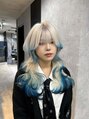 全体はブリーチで透明感のあるベースに。エクステで長さとボリュームを出し、毛先にブルーと黒のエンドカラーをプラス。レイヤーとの相性も良く、動くたびに色味が映えるデザインスタイル!