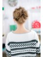こなれ女子の為の色っぽアレンジ。ラフにまとめつつボリューム感を出してグラマラスに。トップをあえて崩したノットヘアで、カジュアルにしつつ今っぽさも取り入れて。サイドのおくれ毛で無造作感を出しながらフェイスラインをカバー。