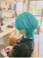 ダブルカラーはお任せください!まずブリーチでとことん抜き、更に追いブリーチでしっかり脱色します♪その上からトリートメントカラーでインディゴ、ターコイズ、アイボリーをバランスよく配合する事でマリンブルーに♪綺麗な水色の完成☆フランキーカラー♪