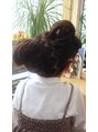 センター付近でジグザグで斜めに分け取り、左右で上下のまとめる位置をバランスよくずらして、ルーズなおだんごを作った、可愛らしいアレンジセットです☆