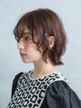 前髪にカールを付けたオシャレウェーブボブ。人気のウルフボブスタイルをベースにしてカジュアル感を出しつつも、フェミニンな雰囲気を演出しています。