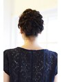トップ、センター、サイドをねじってピンでとめたアップスタイル。あごラインボブでもきちんとした印象になるレディなヘアセットです。最後にしっかりとくずしてふんわり感をつけて。【EARTH豊崎店】