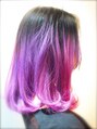 毛先をホワイトブリーチした後に、全体をバイオレットナイト、部分的にクレオローズでポイントカラーを入れています。バイオレットとピンクのコンビネーションが可愛いです。髪質やベースの色によってはトリプルカラーが必要な場合があります。