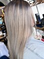 根元を暗めにコントラストをつける“シャドールーツ”で、ハイトーンでも伸びてきた時が自然に馴染むカラーに仕上げています。毛先はブリーチ必須のホワイトベージュ系で、赤みを抑えた柔らかい透明感とツヤが特徴。