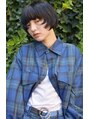 切りっぱなしボブと切りっぱなし前髪。前髪は眉の長さで束っぽくカット。毛先は重めだけど中は軽いのが今っぽい。顎ラインのボブは耳にかけてタイトにスタイリングしてもお洒落。コテで巻いて跳ねさせてもかっこいい!