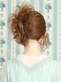 全体にアイロンでゆるく巻き、上下にわけた髪を一度結び、毛先をねじりながらフワフワ立体的なフォルムにアレンジしたスタイル。キメすぎにならないようサイドの後れ毛をバランスよく残します。前髪はサイドに流し、すっきり上品な女性らしさを演出