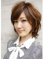 表面の束感と毛先のカールを巧みに融合させた、質感重視のショートヘア。トップのヴェールとえり足の外ハネカールがアクセントになり、フラットになりやすいショートボブを立体的に変身させています。