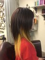 インナー部分のブリーチに酸性カラービビットイエローをのせました^^ダブルカラーにはなるのですが酸性のためダメージは軽減されます
