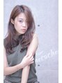 胸にかかるセミロングで、リップラインの長さで前髪を切る。カラーはシナモンベージュの10トーンで。パーマは耳上から緩やかな動きが出るように!