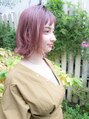 無造作なミディアムワンレンのスタイルです。バングありの髪型でハイトーンのピンク系のスタイルなのでキュートなイメージを入れつつ甘すぎないように外ハネに。バングは少し大きめの隙間を作り肌の露出を多くすると今っぽいです