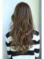 ロングのハイレイヤースタイル。軽さを出すために入れたレイヤーと元々明るめベースの髪色にさらにハイライトをいれ躍動感も出したスタイル。カールアイロンで強めに巻いて、前髪をかきあげるスタイルですのでグラマラスでカッコいいイメージとなっています。