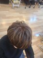 ショートヘアのハイライト。根元は白髪が気になるので明るめでしっかりカバー。動きを出したいトップ周辺に細めでハイライトをいれさせてもらいました。ハイライトいれることで巻かなくてもWAXだけでのお仕上げでもOK。白髪ぼかしにもなるのでオススメです!