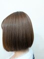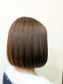 カラーはオレンジみを抑えた透明感のあるサファイアベージュ。軽くしすぎずハネにくい長さのボブです。コアミートリートメントでツルツルサラサラに♪