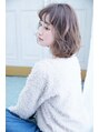 丸みのあるボブ。顔まわりはマッシュなラインを加えてやわらかさをプラス。重たすぎないようにトップにはハイレイヤーで動きをだしています。全体にふんわりするぐらいでパーマをかけているのでストレート毛の方でもやわらかな質感になります。