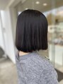 やわらかい質感が残る縮毛矯正でつるんとしたツヤ髪に。コンパクトなボブと相性がよく首元がすっきり見えるシルエットに仕上げています。広がりやすい方でもお手入れがラクなストレートボブ。