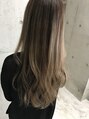 根元部分は暗めのカラーで、毛先はブリーチを活かして明るめの透明感のあるベージュのカラーリング。ブリーチ回数の目安は2回くらいです。