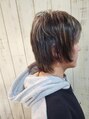 ウルフスタイルをベースに左右の長さの差を付け、前髪も左から右へ流れるアシンメトリーにカット。カラーは自然な地毛をベースに表面に太めのハイライトを入れました。