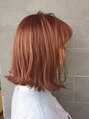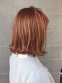 肩についたらはねるくらいのまっすぐボブ。全体に細くハイライトを入れ、明るめのピンクベージュをオンカラー。柔らかく軽やかな印象に。くしゃっと巻いた前髪でカジュアルさを。
