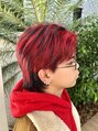 メンズデザインカラー赤をベースにローライトでより毛流れのメリハリをはっきりと!今回はお客様の要望で襟足だけ左右非対称にしたいとの事だったので、半分は「赤」、半分は「黒」でデザインしました!