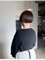ブリーチ無しのダブルカラーでダメージ少なく、透明感の出やすいカラーですオン眉バングと襟足短めボブでモードなスタイルです