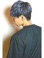 少し長さを残し気味の刈り上げの無造作ネープレスショートスタイル。カラーリングは、毛先に残ったブリーチ毛を活かしてグラデーションのブルージュカラー。