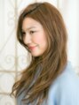 似合わせ小顔カット。前上がりのロングレイヤースタイル。前髪から顔周り、トップにレイヤーをつなげて重軽スタイルにカット。カラーは7~9レベルのアッシュブラウンで髪色に透け感と柔らかさを。太めのロッドを巻いて透明感のあるカールを☆