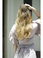 表面にレイヤーを入れ、ウェーブの立体感と浮遊感を出しました。カラーはバレイヤージュでケアブリーチを2回行い、オンカラーでアディクシーカラーのブロンドを入れて、外国人風透明感カラーに。