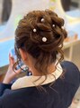 ゆるく崩したシニヨンにパールを散りばめた上品アレンジ。後れ毛で柔らかさを出しつつ、抜け感のある仕上がりに。結婚式や二次会、パーティーなど幅広いシーンにおすすめの大人可愛いスタイルです。