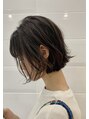 細かくハイライトカラーの入った短め切りっぱなしボブスタイルです。表情がつけられる様に顔周りやトップに動く髪を作ってあります。