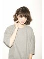 ボリューム感たっぷりでラフなカールのミディアムボブ。長めの前髪でボブなのに甘すぎない印象に。ラベンダーアッシュで柔らかさを、全体に大きめのパーマでふんわりと。ボリュームが欲しい方や、ストレートボブに飽きた方にオススメです。