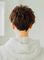 サイドを刈り上げたツーブロック。オーバーはソフトツイストでランダムな動きをつけています。少しウェットな仕上がりにすることでワイルドな印象になります。