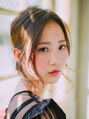 顔周りに少し多めにおくれ毛を残したルーズなアップスタイル。 バックは表編みにして下方で毛先をしまいこむようにロール状にまとめています。正面からがルーズな分、バックはすっきり綺麗にまとめるとバランスが良いです
