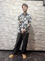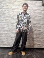 個性派柄シャツに黒のワイドパンツを合わせたモード寄りコーデ。足元はスエード調シューズで程よく力を抜き、大人の余裕と遊び心を感じるバランスが魅力。