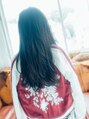 切りっぱなし風重軽ロング。毛先は無造作でラフな動きが出るように毛量調整しながらカットしています。センターパートや流しバングもにあわせOK!直毛の方にはゆるく巻き仕上げかパーマをかけるのがおすすめ!