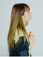カットベースは重ためのワンレングスベースですがバックシルエットがVラインになるように前上がりにカットしあります。前髪も重ためのワイドバングですが明るめのオレンジブラウンカラーにより大人しい印象の中にも個性的なイメージを引き立てています。
