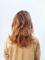 レイヤーが入ったセミロングスタイルです。カラーは毛先にいくにつれて明るくなるグラデーションカラーで、イエローオレンジをオンカラーしています。