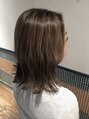 ハイライトをはちより上に細めに入れ、全体的に、8トーンのフォギーベージュとブルーアッシュ、モノトーンをのせました。ハイライトには、少し色が入る程度にして存在感を残しました。