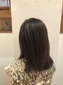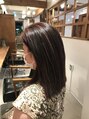カットは少し長めの前下がりボブです。カラーは地毛にブリーチでハイライトを全体的に細めに入れ、アクセントカラーのバイオレットとレッドで乗せました。地毛がベースなので、プリンも目立ちにくく、白髪が気になる方にお勧めです。