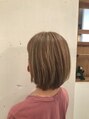 全体を白髪染めしていたのを明るくしていくのに、ブリーチでウィービングを入れてトーンアップしました。リタッチはオシャレ染めのベージュ10トーンで、乳化してブリーチ部分に色味を乗せました。カットはボブレイヤーです。