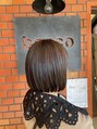 カットは襟足ギリギリのミニボブです。ラインは切りっぱなしで毛量調整をしてあります。カラーは、ブリーチなしでのカラーで最大限に明るくハイライトを入れ、ベースは6トーンのアッシュ系を入れました。