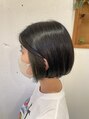 カットは切りっぱなしボブで、少し前下がりです。毛量調整をして、タイトにおさまるようにしてあります。カラーはインナーカラーをブリーチでぬいて、上からグリーンをのせました。
