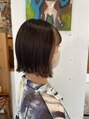 カットは切りっぱなしのミニボブです。襟足はアイロンで外ハネできる長さを残し、毛量調整してあります。カラーは前髪内側と、サイド内側にブリーチを入れ、シルバーアッシュの8トーンをのせました。トップにはアッシュブラウンの6トーンをのせました。