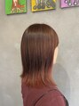 カットはミィディアムの外ハネスタイルです。前髪は眉下からラウンドでサイドバングまで繋いであります。カラーは、インナーカラーをブリーチでサイドからバックにかけて入れてあり、全体をピンクとオレンジをミックスした8トーンで被せました。