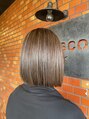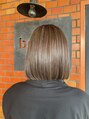 カットは顎ラインのフラットなボブです。アウトラインを残して毛量調整をしました。カラーはブリーチでハイライトを入れ、全体をシルバー系で被せました。