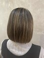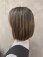 カットは肩につかない位の切りっぱなしボブです。地毛をベースに全体的に細くハイライトをブリーチで入れました。プリンが目立ちにくく、白髪ぼかしにも良いです。