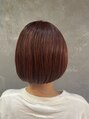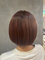 カットは顎ラインの真っ直ぐボブです。カラーは、ブリーチでハイライトをはちより上に細めに入れてから、全体にピンクの8トーンをのせました。