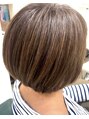 細かいハイライトでグレイヘアと馴染むカラーにしていますぼかす時はハッキリと目立ちすぎないようにハイライトを入れていく事が多いです根元もやんわりと染まるイメージです褪色してきたらオンカラーのみ、2~3回に1度ハイライトというペースが理想です