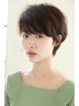 カットは、ハンサムショートの前髪を少し切り込んでマニッシュ風にアレンジ♪少し柔らかさを出すために、空気感を出せるように質感を調整しました。カラーは、落ち着いた、ブラックブラウンです。柔らかさを出すために、アッシュを少し足しています。