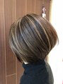 シンプルな前下がりボブ。ウエイトは上げすぎず、下げすぎず、ナチュラルにアタの形が360度どこから見ても綺麗なシルエットになるようにカットしてあります。ハイライトを入れることによって立体感や動きをつけてあげるとおしゃれ度がUPします。